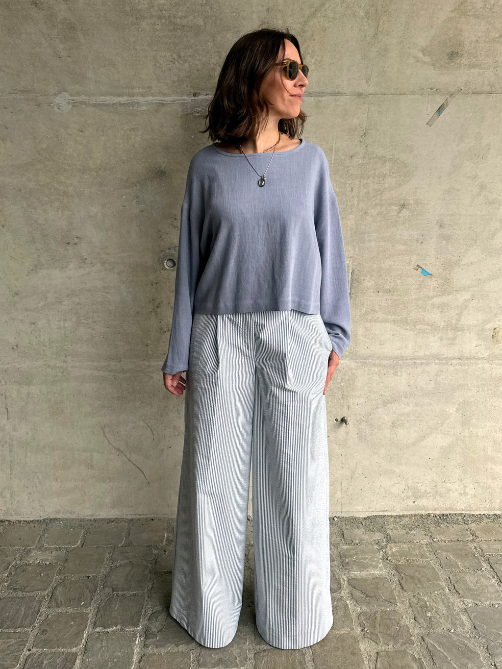 Clio pants Seersucker stripes van Mon Col brengen summer sophistication naar je garderobe met het klassieke seersucker materiaal en tijdloze streepprint.
