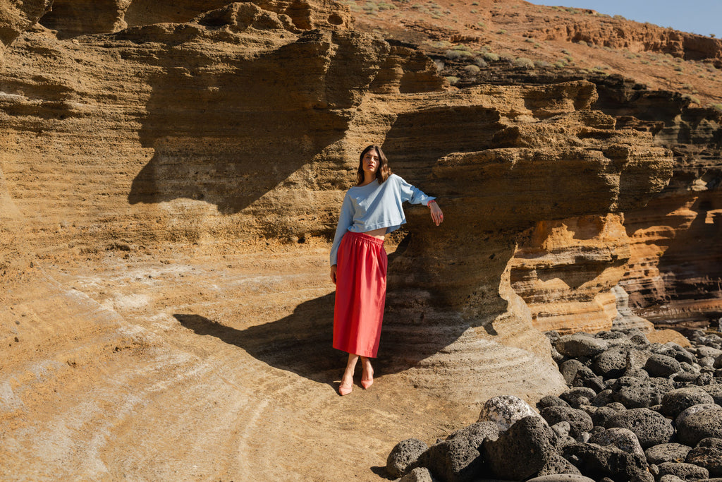 De Coco-rok is een midi-rok gemaakt van verantwoord geproduceerd BCI-katoen in een warme bessenkleur. De elastische tailleband zorgt voor comfort de hele dag door en de zijzakken zijn extra praktisch. Deze rok is perfect voor zowel casual outfits overdag als elegante avondkleding, waardoor het een onmisbaar item is in elke garderobe.