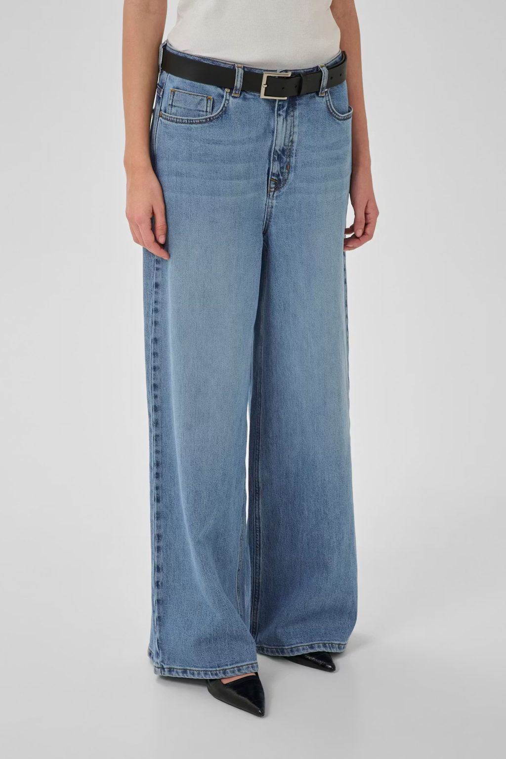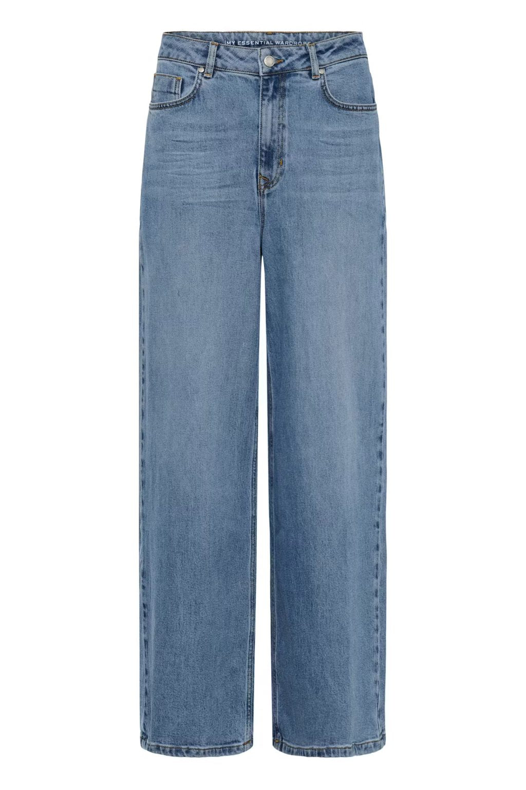 Jeans met wijde pijpen, een hoge taille en een klassiek five-pocket model. Voorzien van een gestructureerd, lang model en een knoopsluiting. De gladde, zacht afgewerkte denimstof zorgt voor een relaxte maar toch getailleerde look, perfect voor dagelijks gebruik.