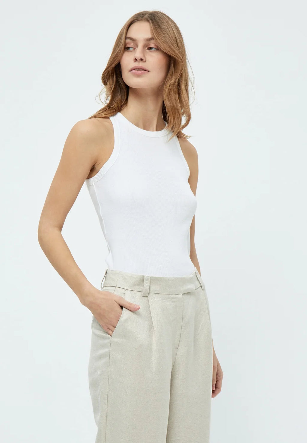 Maluna GOTS Rib top White van Minus brengt sustainable sophistication naar jouw garderobe met biologisch katoen en ribmateriaal voor een getailleerde pasvorm die comfort en bewustzijn combineert.