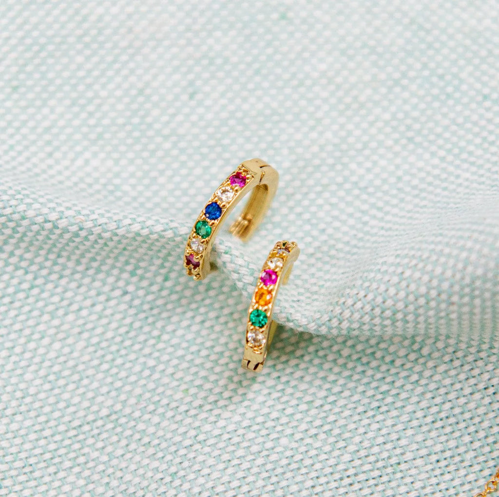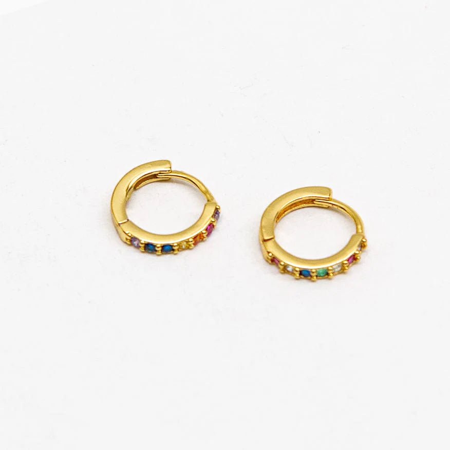 Shimmer and shine! Prachtige hoops met gekleurde zirkonia-steentjes.Ideaal om er meerdere in één oor te dragen, je koopt ze per stuk. What's not to like? PER STUK. Wil je een paartje? Koop dan twee stuks ajb. Materialen: messing verguld, zirkonia. Kleur: goud en multi. Afmetingen: +/- 13mm en 2mm breed.