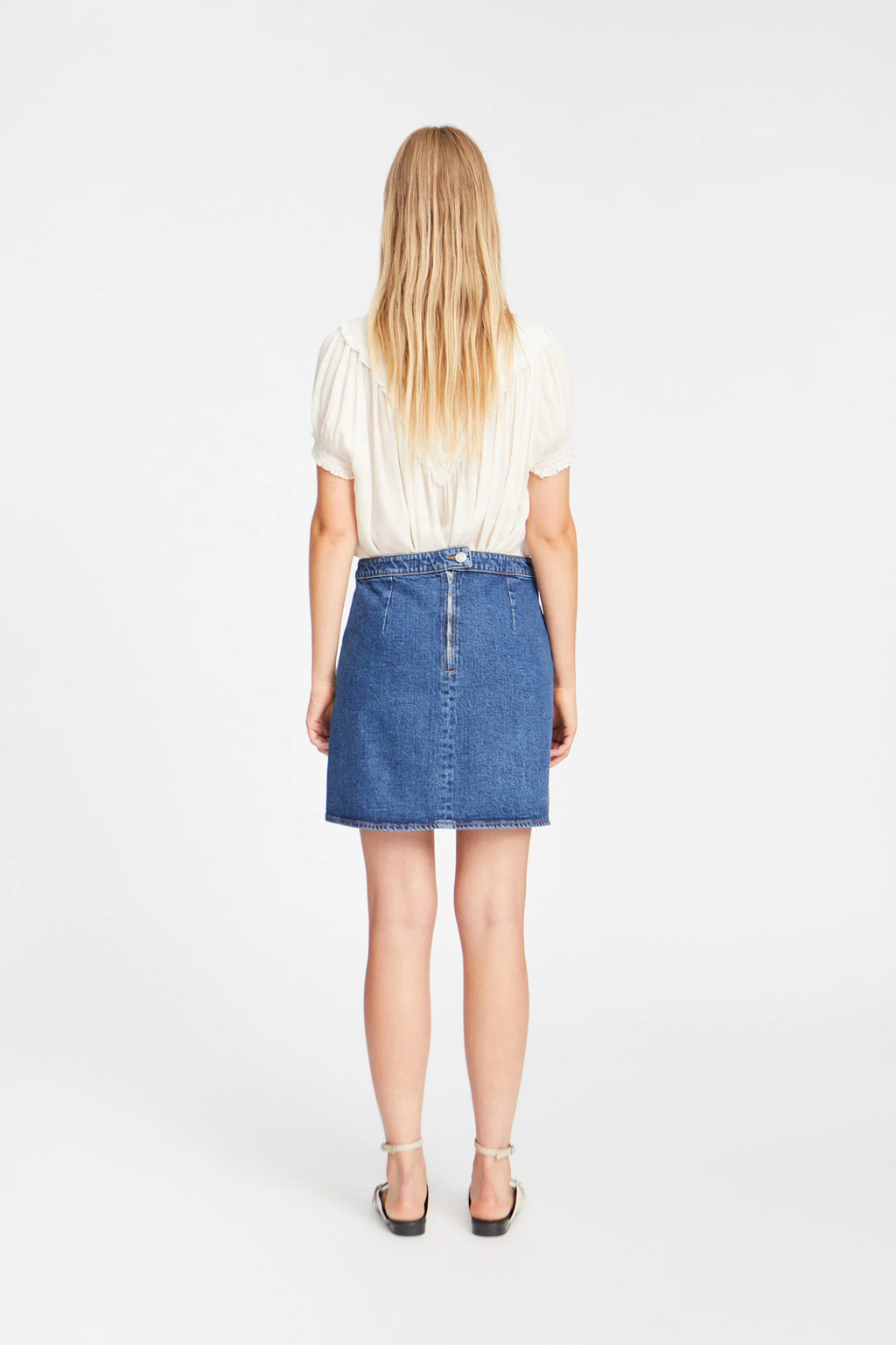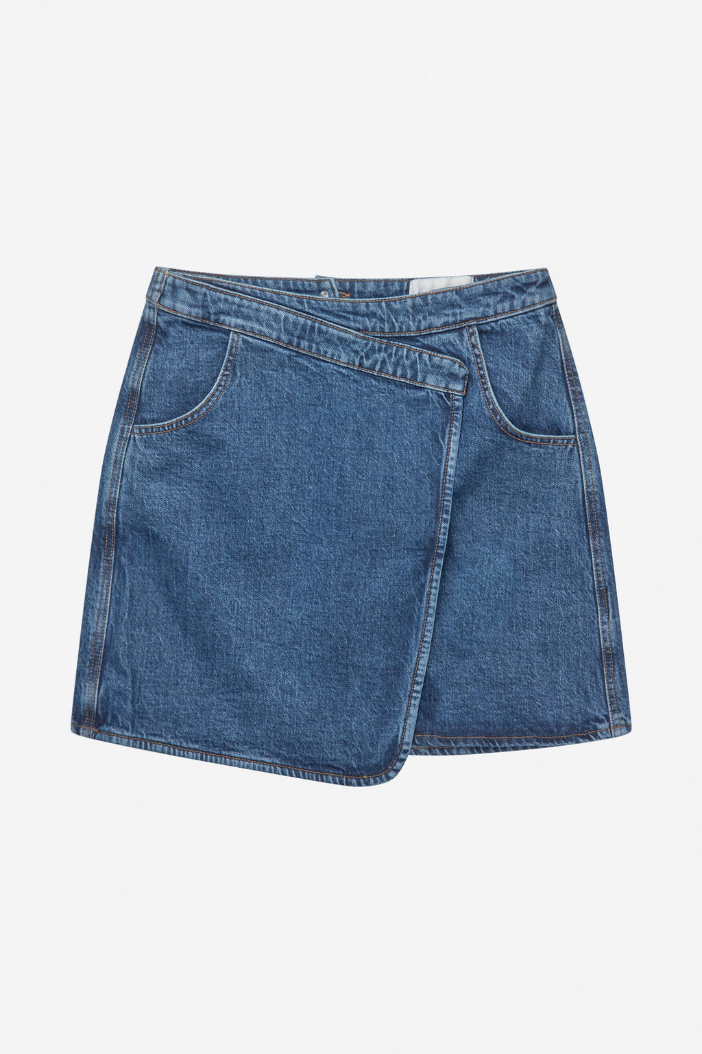 Een korte denim rok met een elegant wikkeleffect. De rok heeft zakken en een rits- en knoopsluiting aan de achterkant.