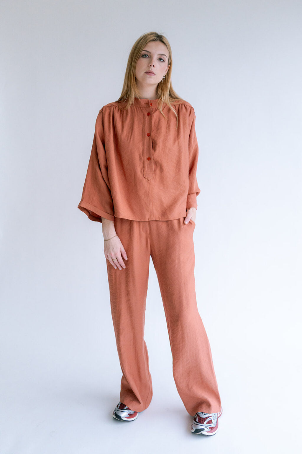 Deze broek in een mooie licht glanzende roestbruine kleur is rechter van model, de elastiek achteraan in de taille dat zorgt voor een mooie pasvorm..