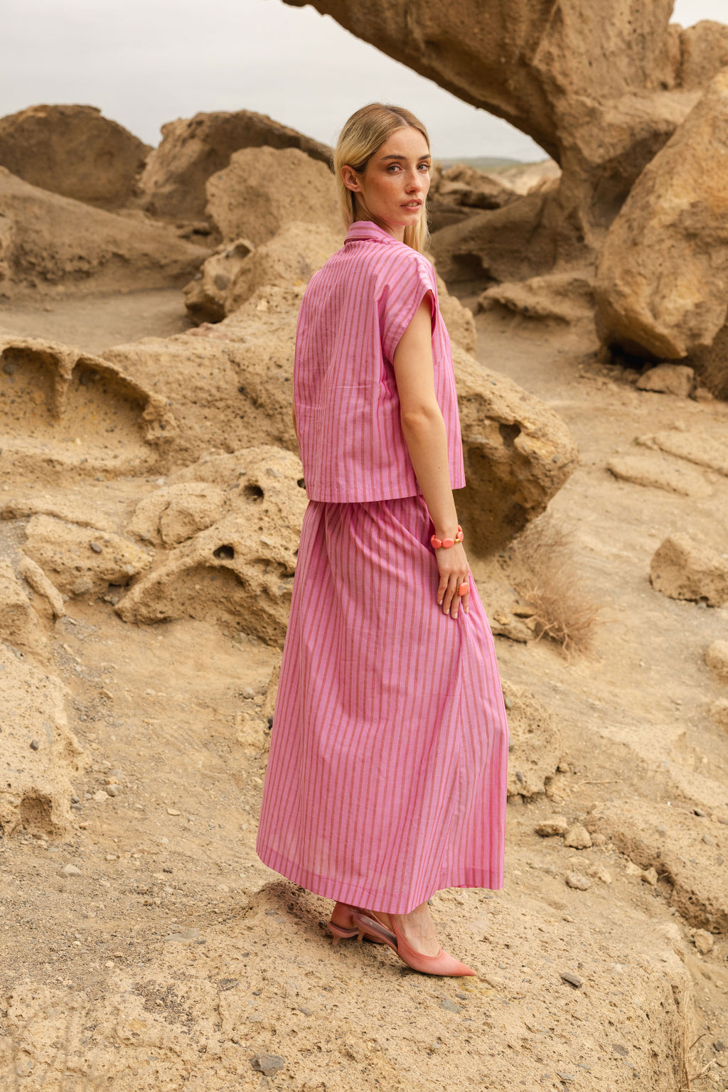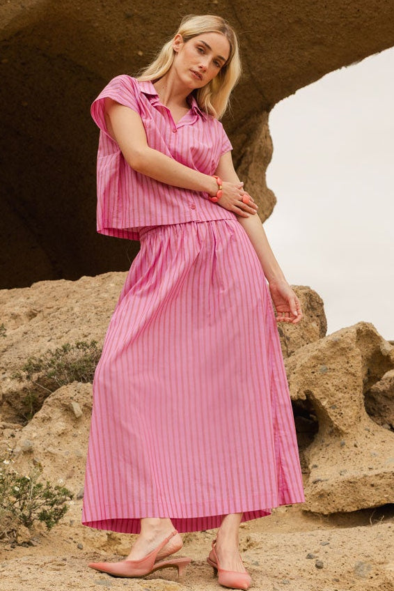 Creëer moeiteloos een zomerse stijl met deze lichtgewicht katoenen blouse. De omkeerbare en afneembare kraag zorgt ervoor dat je de blouse kunt aanpassen aan je stemming – draag hem met of zonder kraag, of met de kraag omgekeerd. De zomerblouse heeft korte mouwen en een licht cropped silhouet. Het roze streepjespatroon voegt een vleugje kleur toe aan je garderobe.